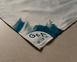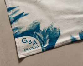 J'aime également travailler avec la cyanotypie, qui est un procédé photographique monochrome ancien, par le biais duquel on obtient un tirage photographique bleu de Prusse, bleu cyan. Nous avons utilisé cette méthode pour faire des serviettes en tissu, cadeau avec lequel nos invités du mariage sont repartis.